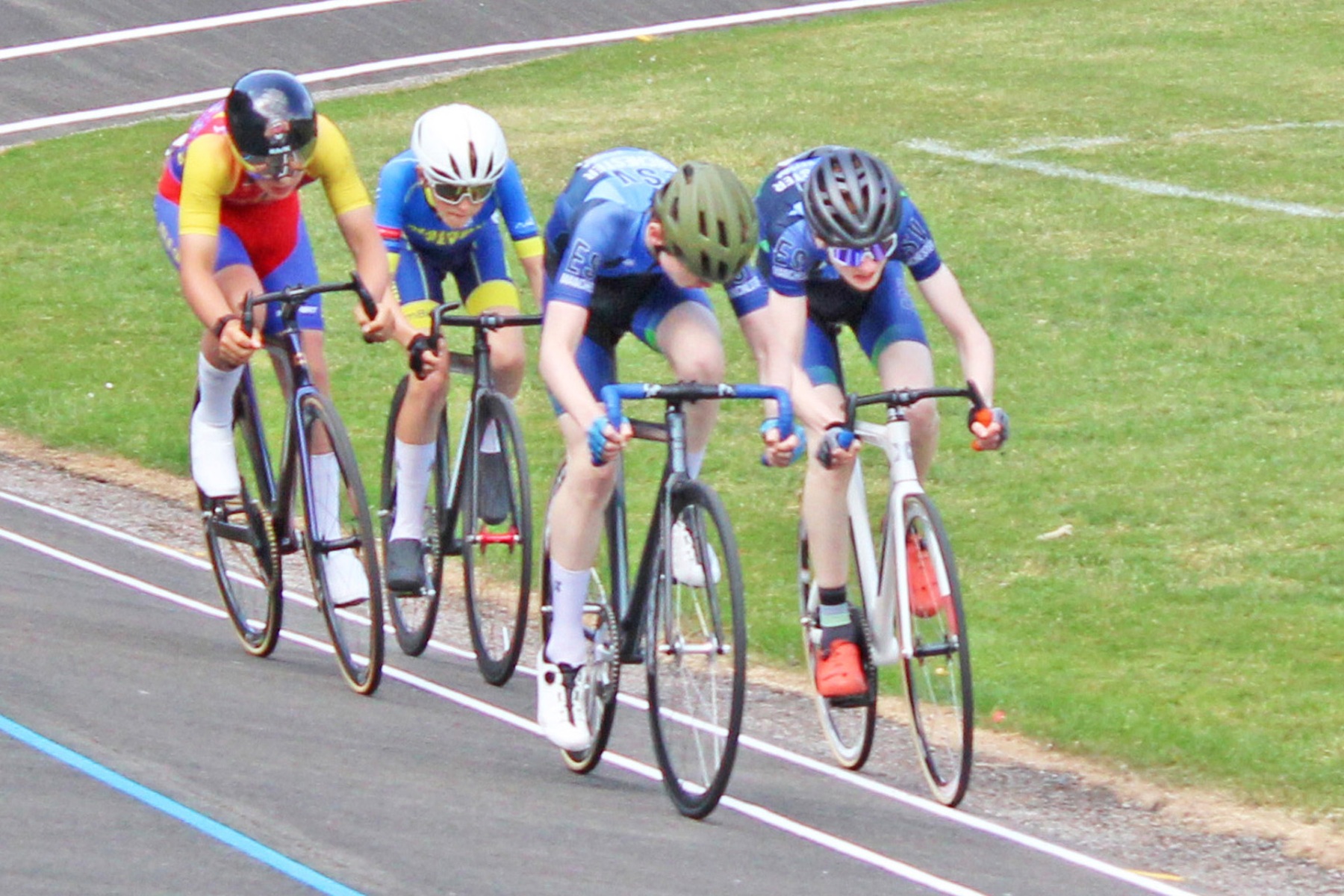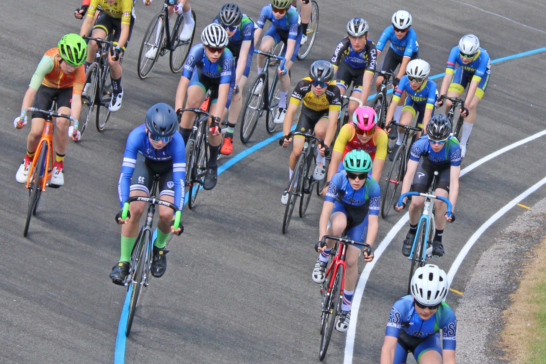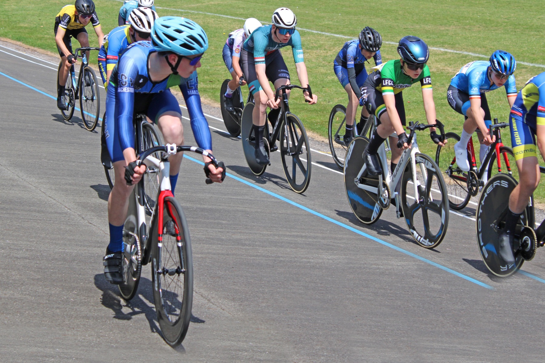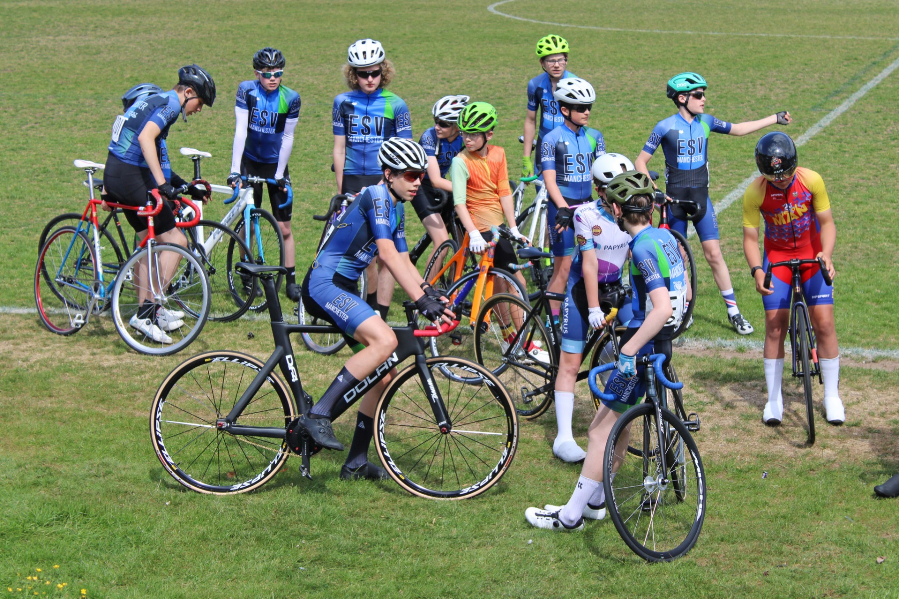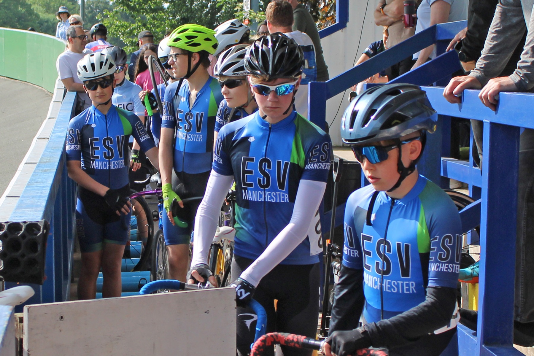 The National Youth Omnium Series event at the Lyme Valley Stadium in Newcastle-under-Lyme in May saw ESV Manchester represented by its largest-ever contingent of riders. 20 boys and girls wore the club’s colours across the three age groups – under 12s, under 14s and under 16s with many getting their first experience of racing at a national level. Those without their own bikes rode bikes provided by ESV after a number of our coaches spent the weekend putting them together so everyone who wanted to could race.